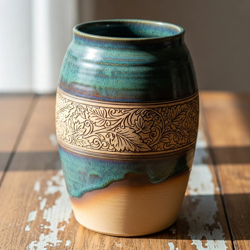 Elegant hand-thrown ceramic vase with a unique glazed finish. Perfect for displaying flowers or as a standalone decorative piece.