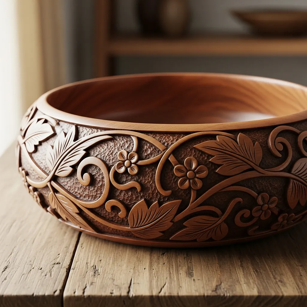 Stunning wooden bowl carved from a single piece of premium hardwood. Showcases the natural grain and beauty of the wood.
